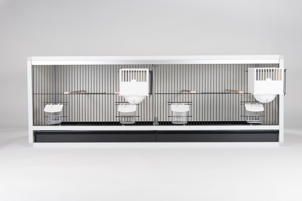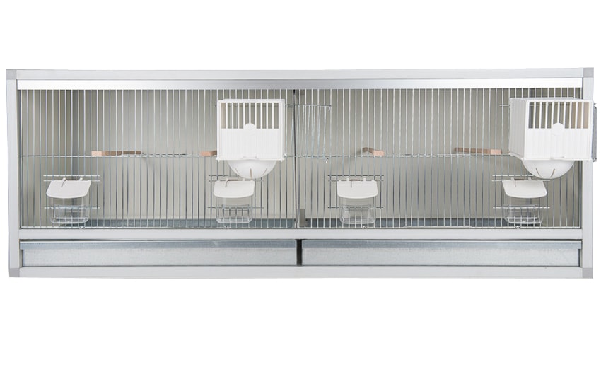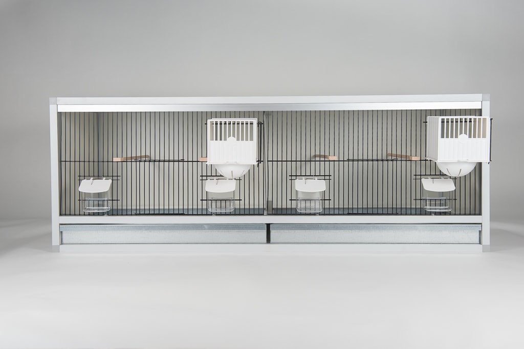 Aluminium broedkooi 120 cm breed 2 vakken met keizersnestkasten, kweekooi met uitschuifbare tussenwand. Kleur voorfront en lade optioneel.