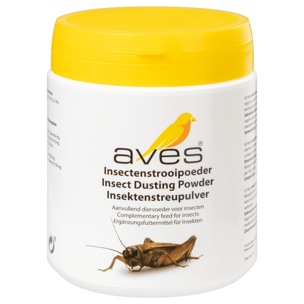 Calcium, vitamine A en vitamine D3 tekorten bij vogels en reptielen kunnen voorkomen worden door voederinsecten te bepoederen met Aves Insectenstrooipoeder.