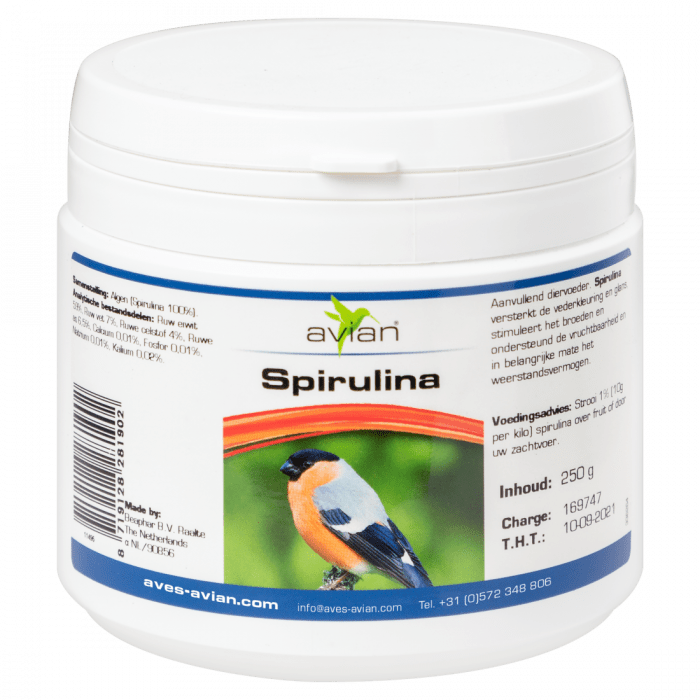 Avian Spirulina is een micro-algensoort in droge poedervorm voor weerstand en vederpracht.