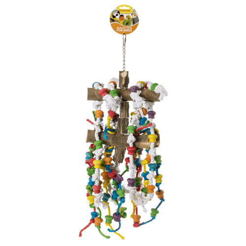 Houten zitstok met touwknopen, een stoere en uitgebreide speelhanger in vrolijke bonte kleuren. Deze zitstok is voorzien van alle voorkomende gemakken en is een echt feest voor elk papegaai of kaketoe.