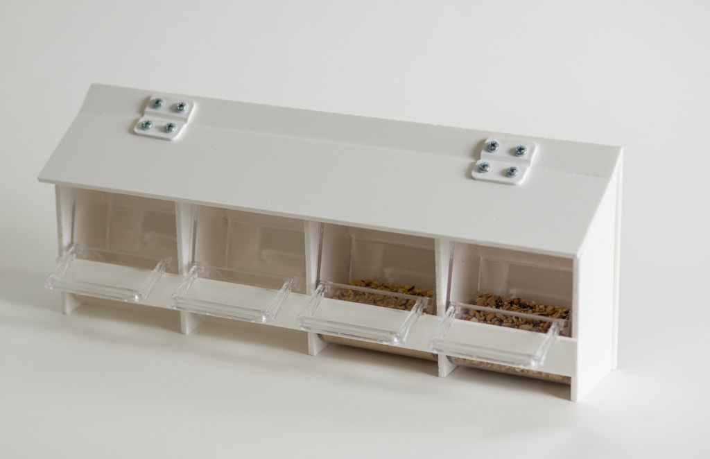 Kunststof voersilo met vier klepbakjes. Deze klepbakjes kun je gemakkelijk in- en eruit halen. Dak is scharnierbaar.