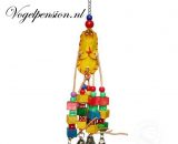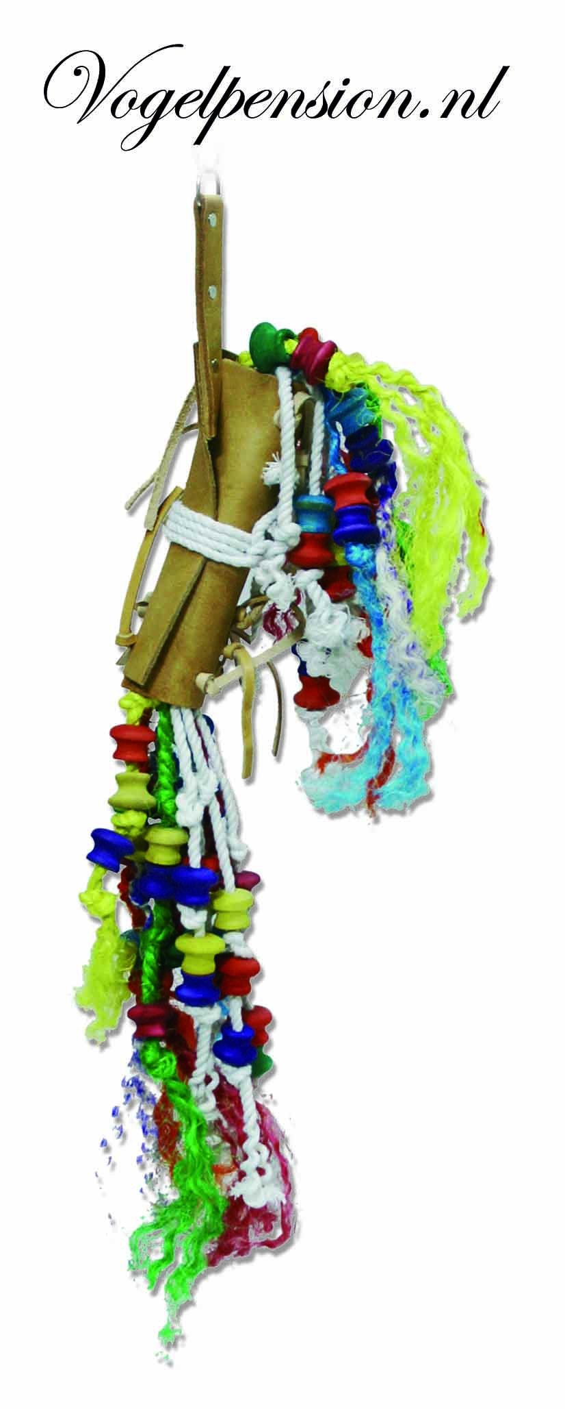Reusachtig lederen speelgoed met veel sisal, katoen en lederen stukken. Daarnaast natuurlijk vele houten onderdelen voor een gevleugelde vriend(en).