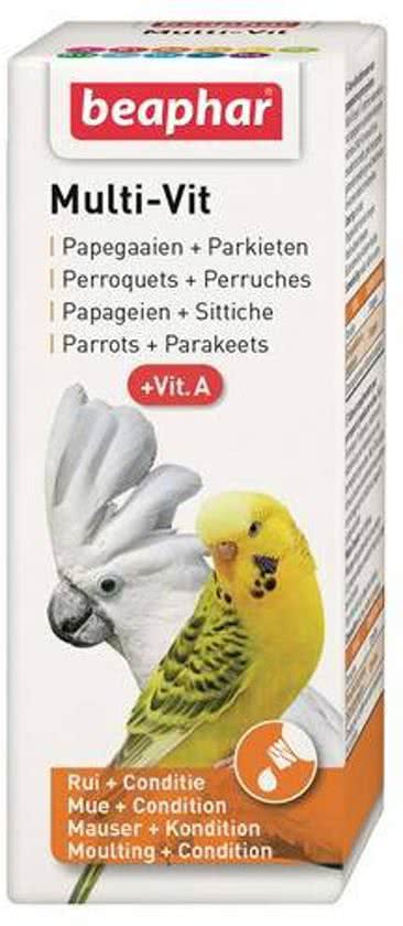 Multi vit Beaphar Papegaaien en grote parkieten bevat 12 verschillende soorten vitaminen waaronder de voor papegaaien en parkieten belangrijke vitamine A. Multi-Vit versnelt de rui, bevordert de conditie, geeft een gezonde glanzende bevedering en vult tekorten aan die kunnen leiden tot vederpikken.