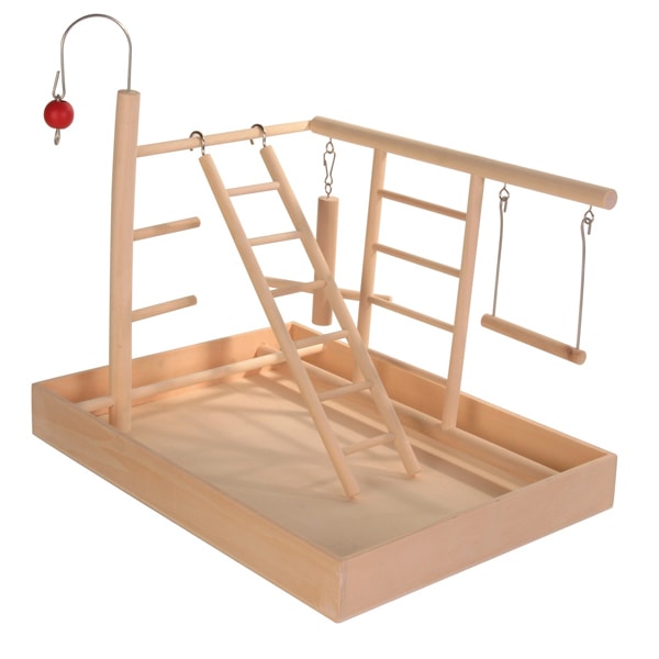 Vogelspeelplaats van hout. Met onder andere een trapje, schommel, diverse zitstokken.